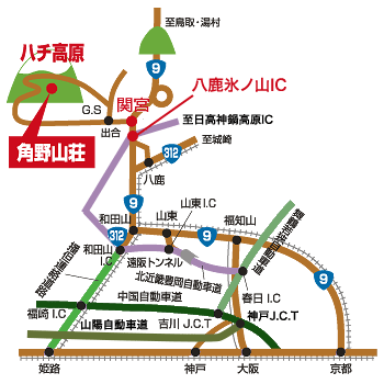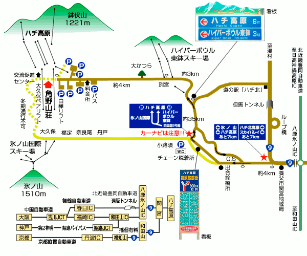 マイカーをご利用の場合 ・中国自動車道(福崎IC)→播但連絡道路(和田山IC)→北近畿豊岡自動車道(八鹿氷ノ山IC)→9号線へ ・中国自動車道(吉川JCT)→舞鶴若狭自動車道(春日IC)→北近畿豊岡自動車道〜遠阪トンネル(有料)〜(和田山IC)〜(八鹿氷ノ山IC)→9号線へ ★冬期は必ずタイヤチェーン・スコップをお忘れなく ★北近畿豊岡自動車道は通行無料です(遠阪トンネルは除く) JRをご利用の場合(冬季) ・山陰本線「八鹿駅」下車→八鹿駅前から全但バス(鉢伏行)乗車約50分→終点で下車→「鉢伏開発観光079-667-8036」の直行バスに乗車→大久保ぺアーリフトでハチ高原へ ※変更がある場合がございますのでお確かめください。 京阪神からの直行バスをご利用の場合 ★ハチスキーバスツアーラクラクお得な直行バス 詳しくはハチ・ハチ北のアクセスページをご覧下さい ■大阪より/約2時間30分 ■神戸より/約2時間20分 ■京都より/約2時間30分 |