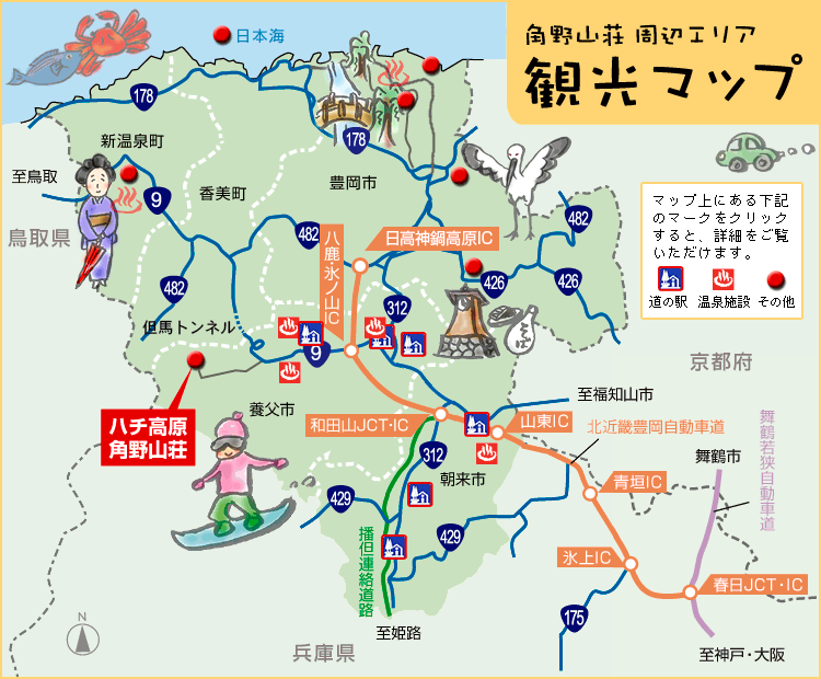 ハチ高原近隣や有料道路近辺には、日帰り温泉と道の駅が点在しています。ゲレンデ帰りに温泉やお土産、お食事などをお楽しみ下さい。マップ上のマークをクリックすると各スポットの詳細をご覧頂けます。