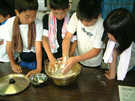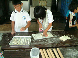 ![]() ▲うどん打ち体験 しっかりこねて腰のあるうどん作ってね |