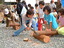 ![]() ▲がんばれ、がんばれ、丸太切り競争 |